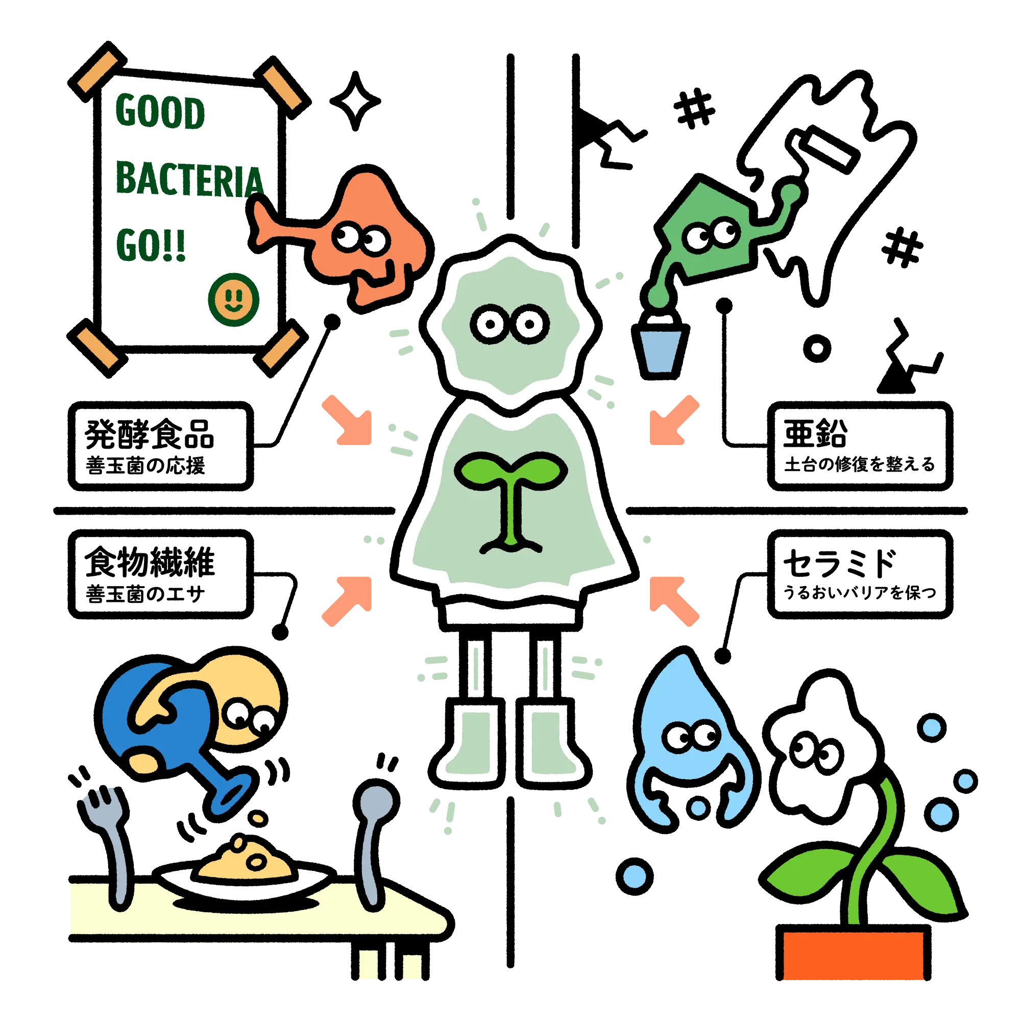 本商品の成分たちが減少した善玉菌の働きを応援し、環境の修繕も行うことで、元気な毎日をサポートをします。